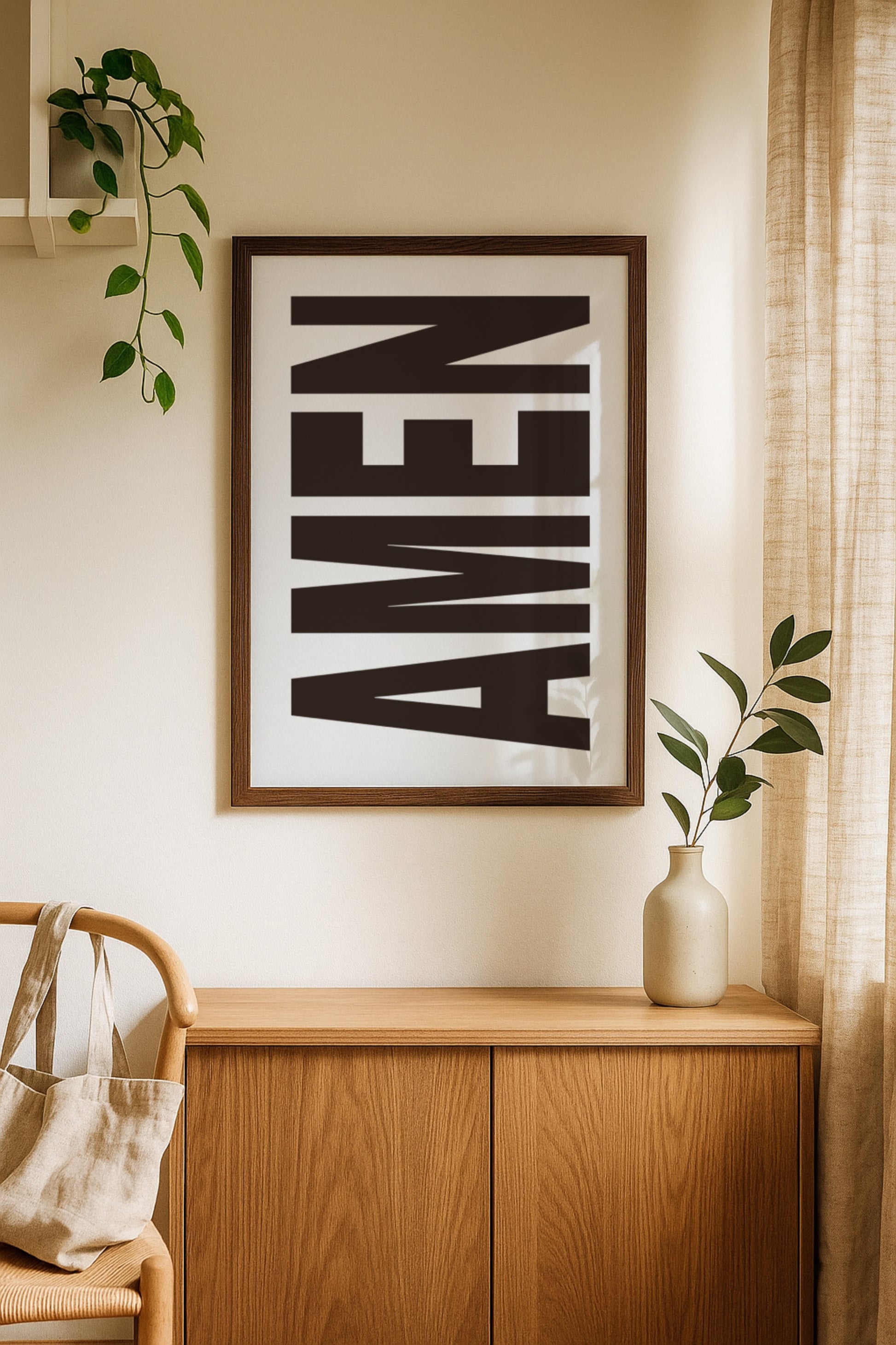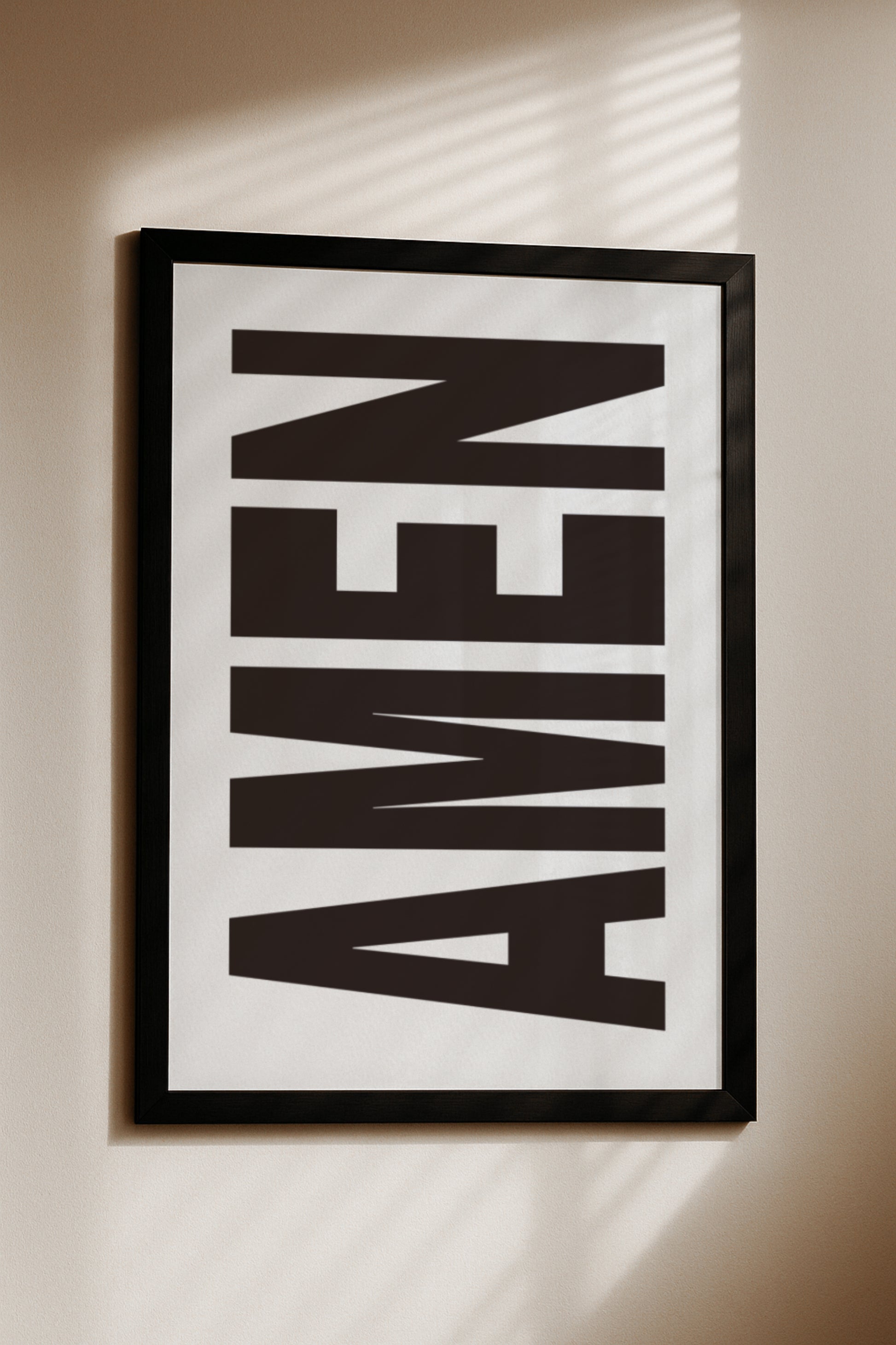 Ein Wort, das mehr sagt als tausend Bilder: Amen. Kraftvoll gesetzt, groß und unübersehbar – dieses Poster ist ein Statement des Glaubens und der inneren Stärke. Minimalistisch im Design, aber voller Bedeutung. Ein moderner Blickfang, der jedem Raum Tiefe und Spiritualität verleiht und täglich daran erinnert, Haltung und Vertrauen zu bewahren.